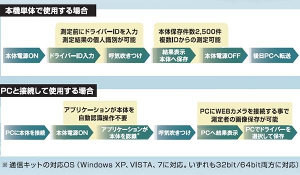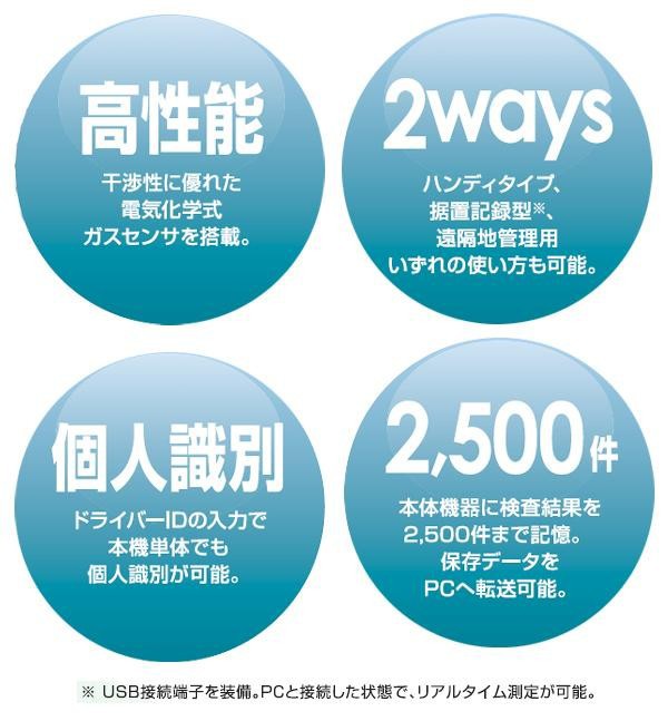 | ガスセンサ専業メーカー「フェガロ技研」のアルコールチェッカーです。運送業の酒気帯び確認を簡単かつスピーディに行うだけでなく、長期的、日常的なデータ管理を円滑に行う事を目的とした機能を搭載し、運輸安全管理業務をサポートします。 |