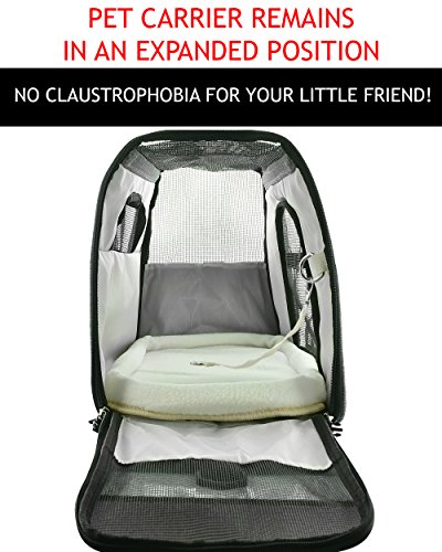 - DESIGN MEETS DURABILITY: Made from high-quality fabric, this pet carrier is designed to last, with a snug fleece cushion where your pet can sleep, play or rest and a sturdy hard bottom for support. Rest assured that your animal friend travels comfortably: this is one soft cat carrier! It can be side loaded: use the durable zipper locks to open or close the carrier any time. Modern, easily portable, and fits under plane seats well. For small dogs to medium sized cats and other such animal pals.