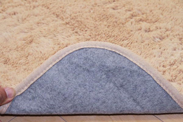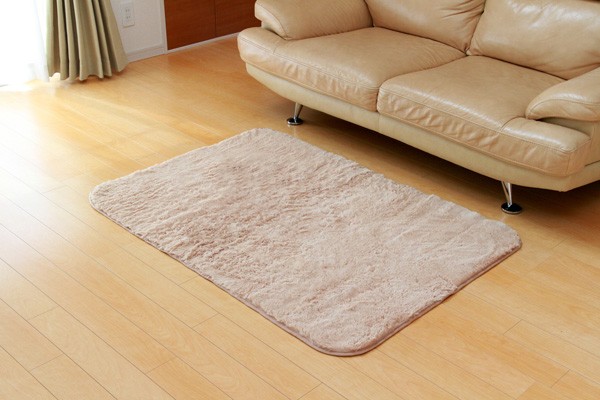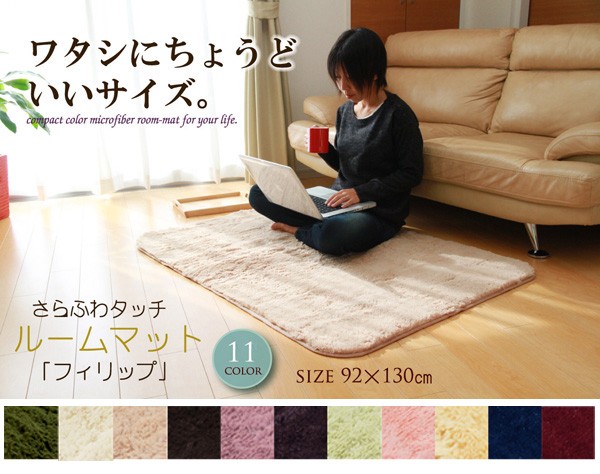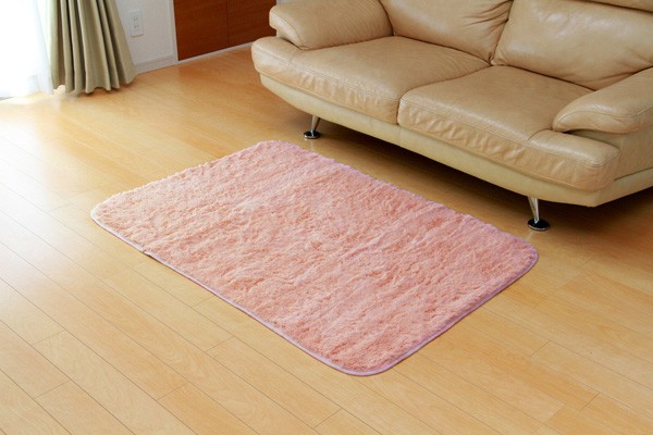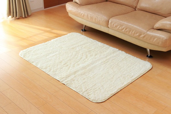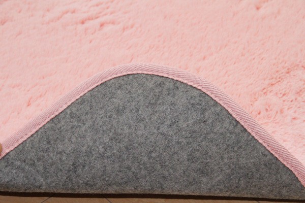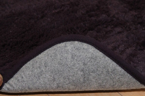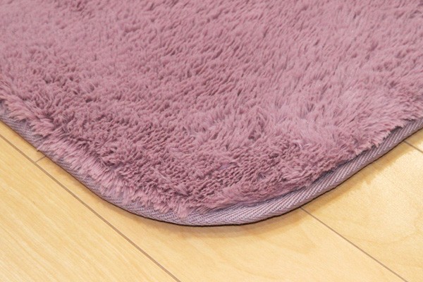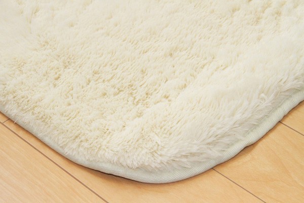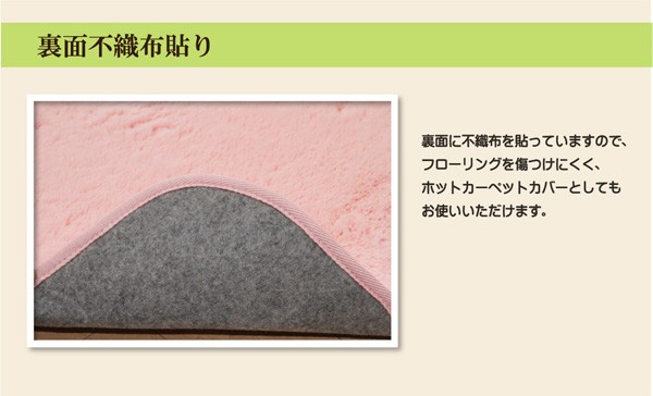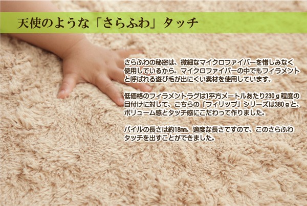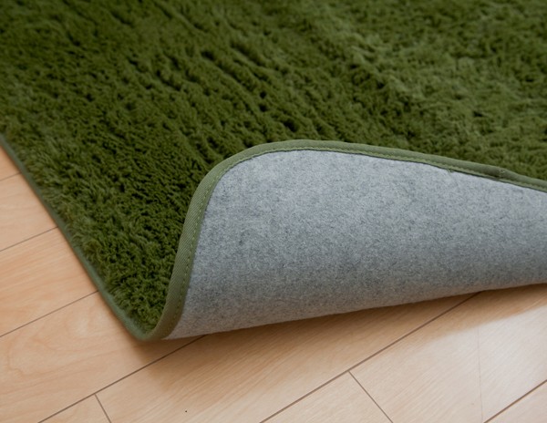 カラーは選べる10色展開です。表地にフィラメント糸(極めて長い繊維)を使用しています。遊び毛が出にくく、耐久性に優れています。パイルの長さは約18mmと適度な長さで、しっとりふわふわとしたやさしいタッチ感を出しました。フローリングを傷つけにくいよう、裏には不織布を貼っています。