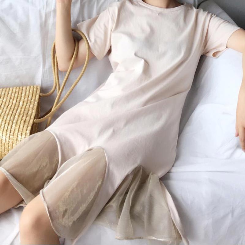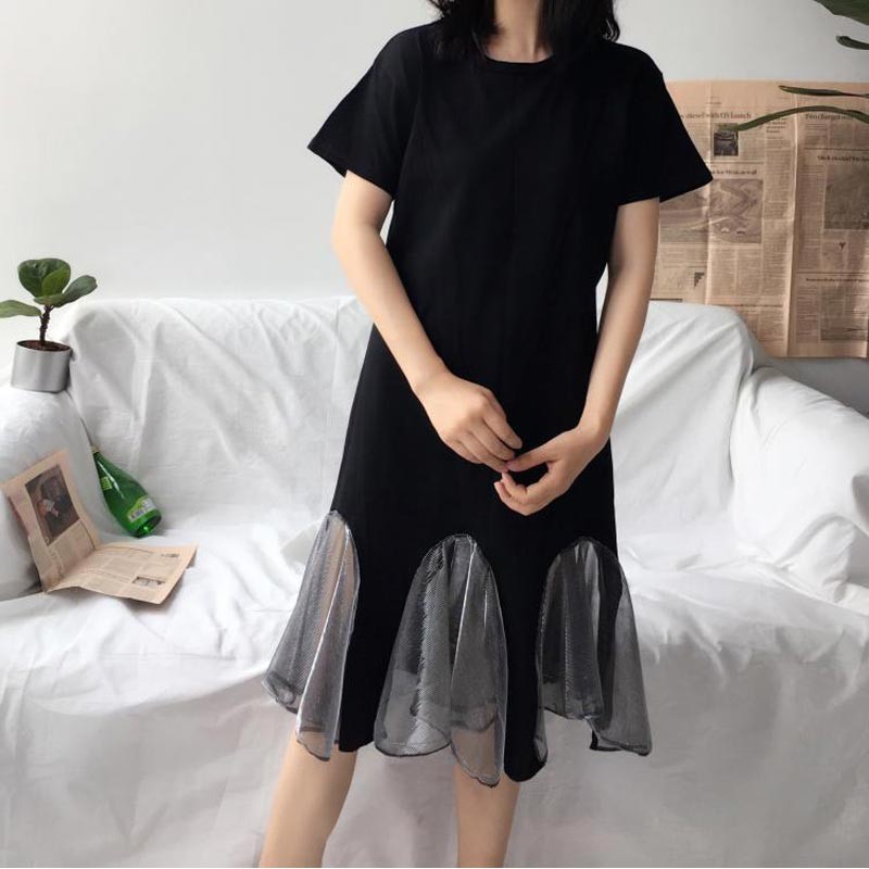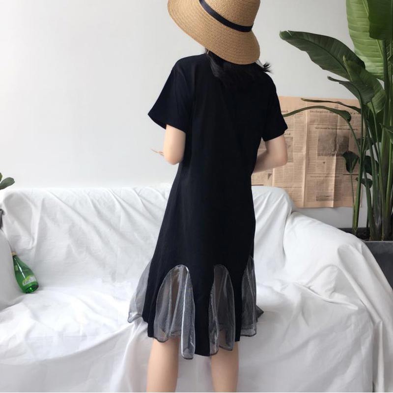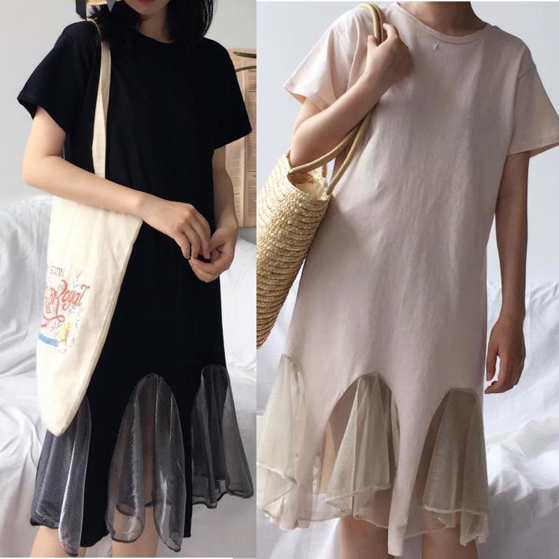 丸首のロングTシャツの裾にチュールメッシュをアレンジしたデザインワンピ♪
