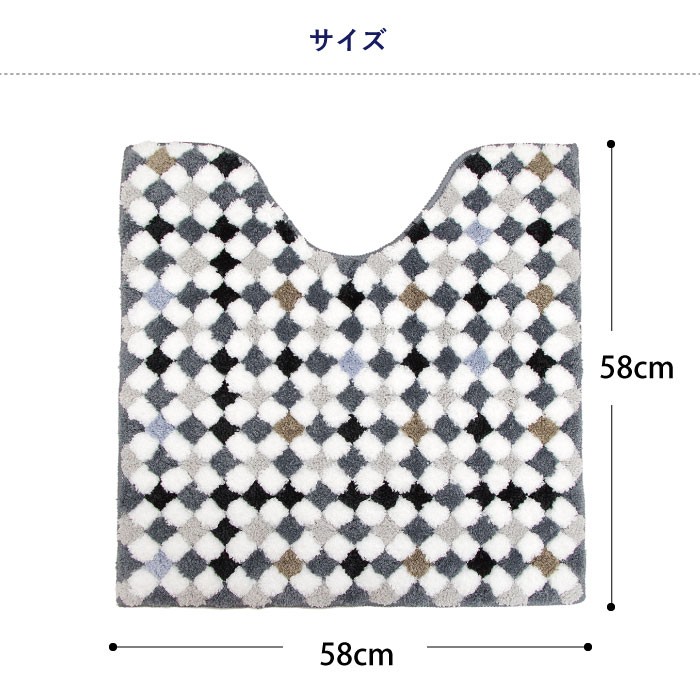 ポコポコとした肌触りの気持ちいい タイル柄のトイレマットです! ■材質 ポリエステル100% ■サイズ 約58×58cm ■特徴/仕様 トイレマットは”すべりにくい加工”済み