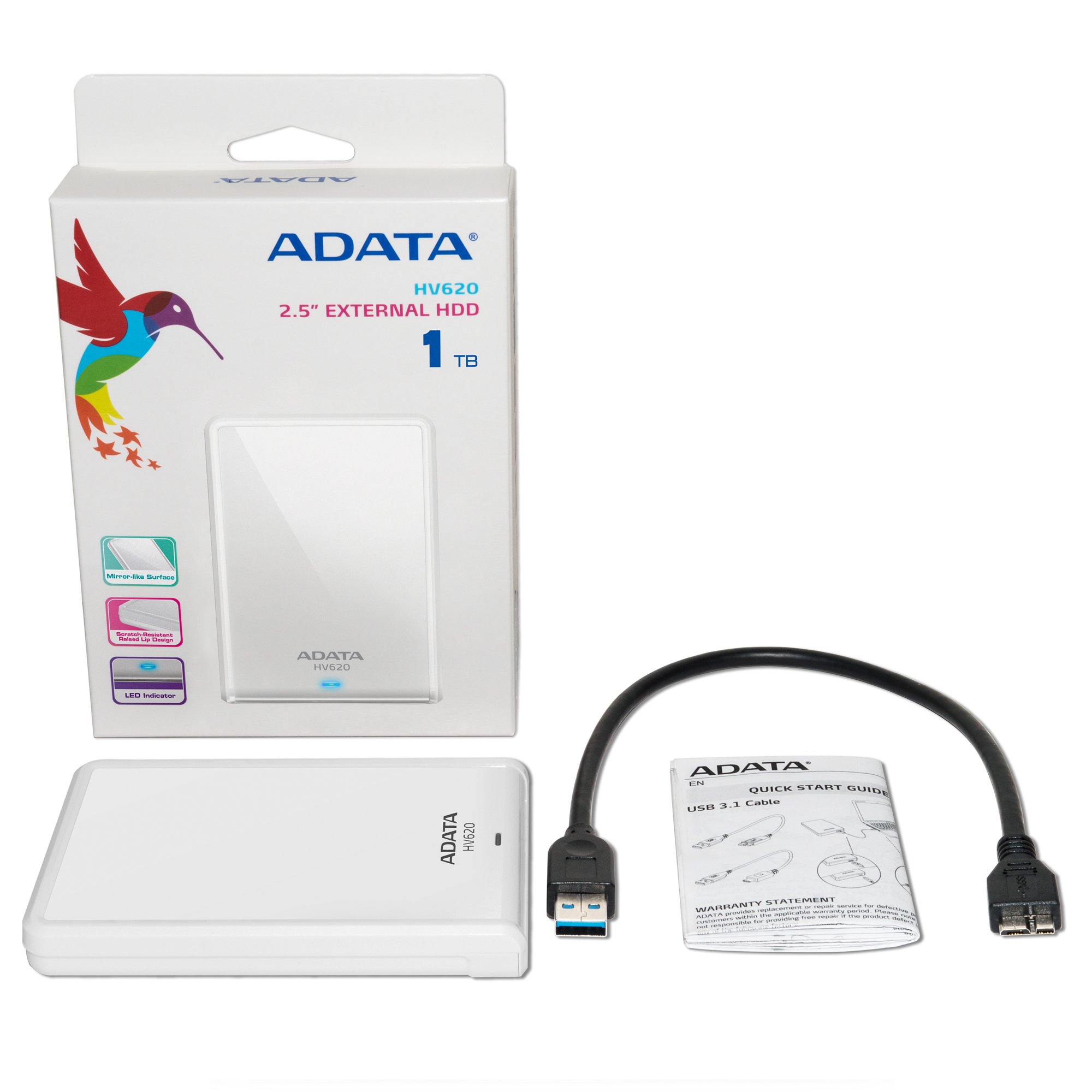 ADATA USA DashDrive HV620 1TB USB 3.0 Portable External Hard Drive - White (AHV620-1TU3-CWH)