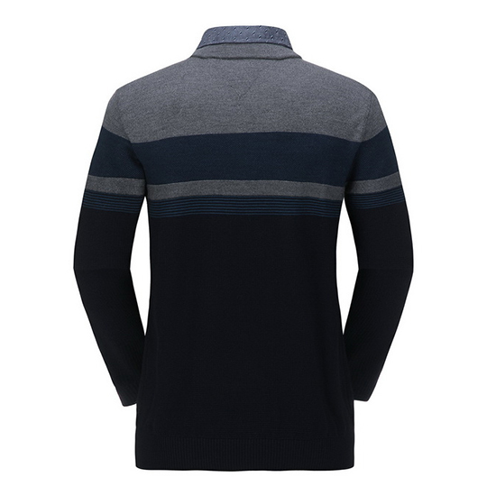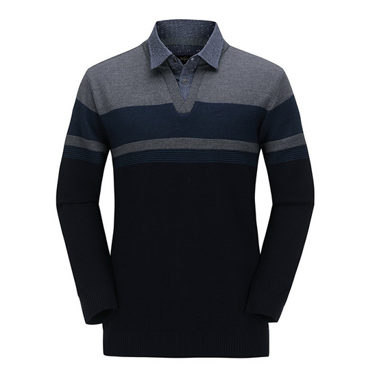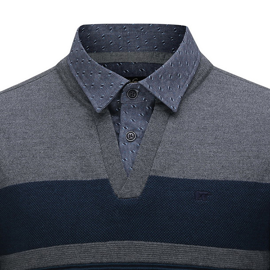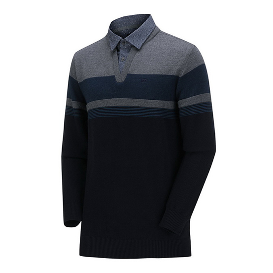 - 블록 믹스 니트에 패턴 셔츠를 레이어드한 남성 니트.