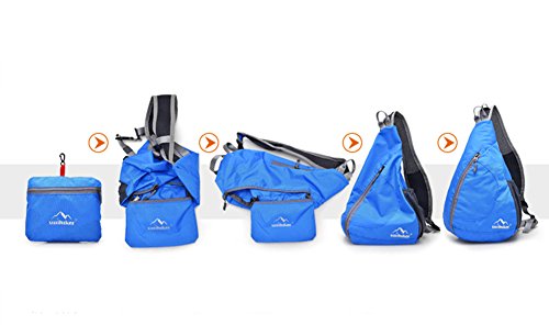 -Can be used both as chest pack and shoulder bag. Can be folded into a pouch and expanded to a large backpack.