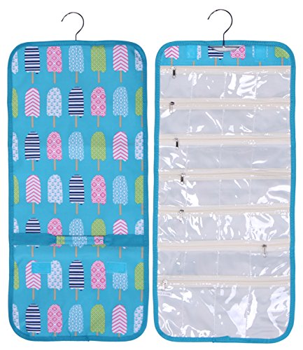 Studio : 101 BEACH Publisher : 101 BEACH Binding : Kitchen Product Description t's easy to take beauty on the go and look stylish doing so with this Hanging Jewelry Organizer. When unfolded, this fold up jewelry bag reveals 2 large 5" x 4" nylon pockets, 24 2 1/2" square clear plastic zippered pockets with plenty of room for all your earrings, bracelets, and necklaces without any loss or tangles. The metal hook makes for easy hanging in a bathroom or closet. Made of a durable polyester with stylish pattern. 0