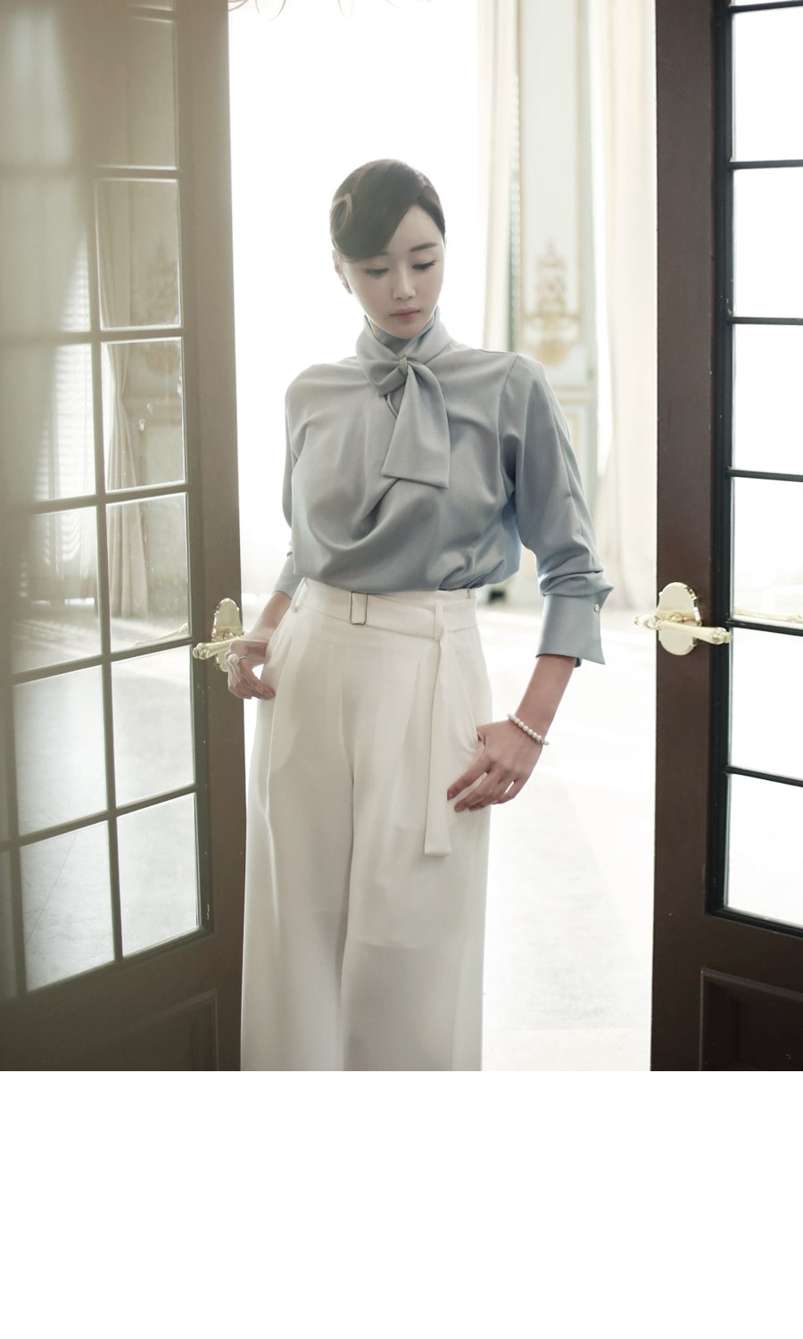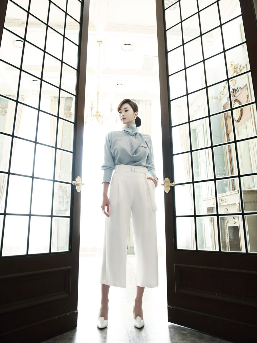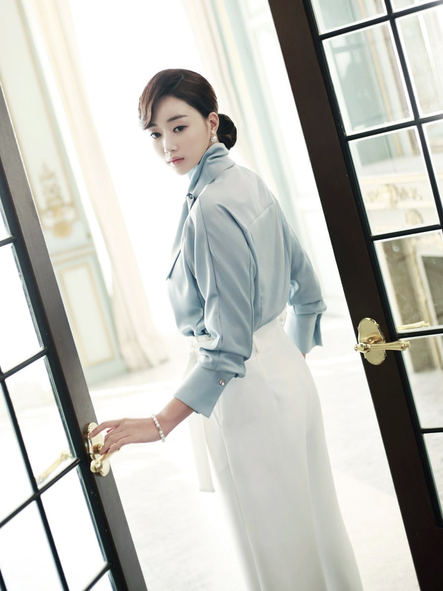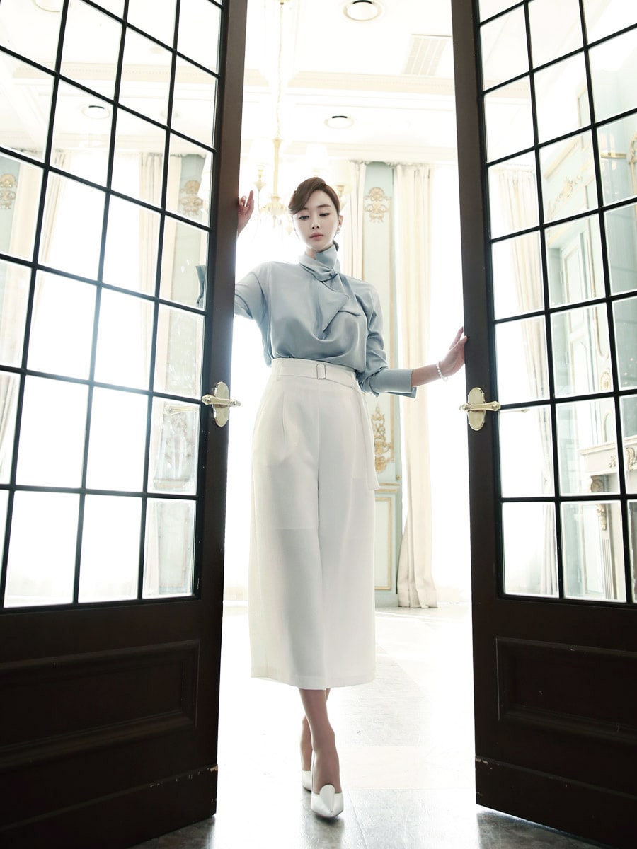B1935 로어 스카프 넥 샤인 블라우스 Sora