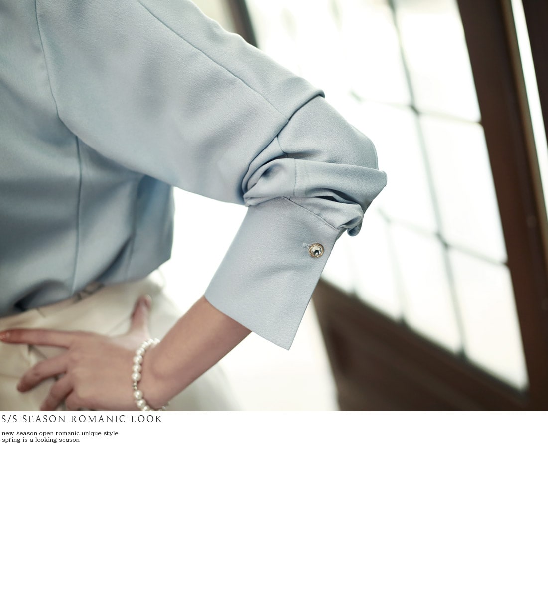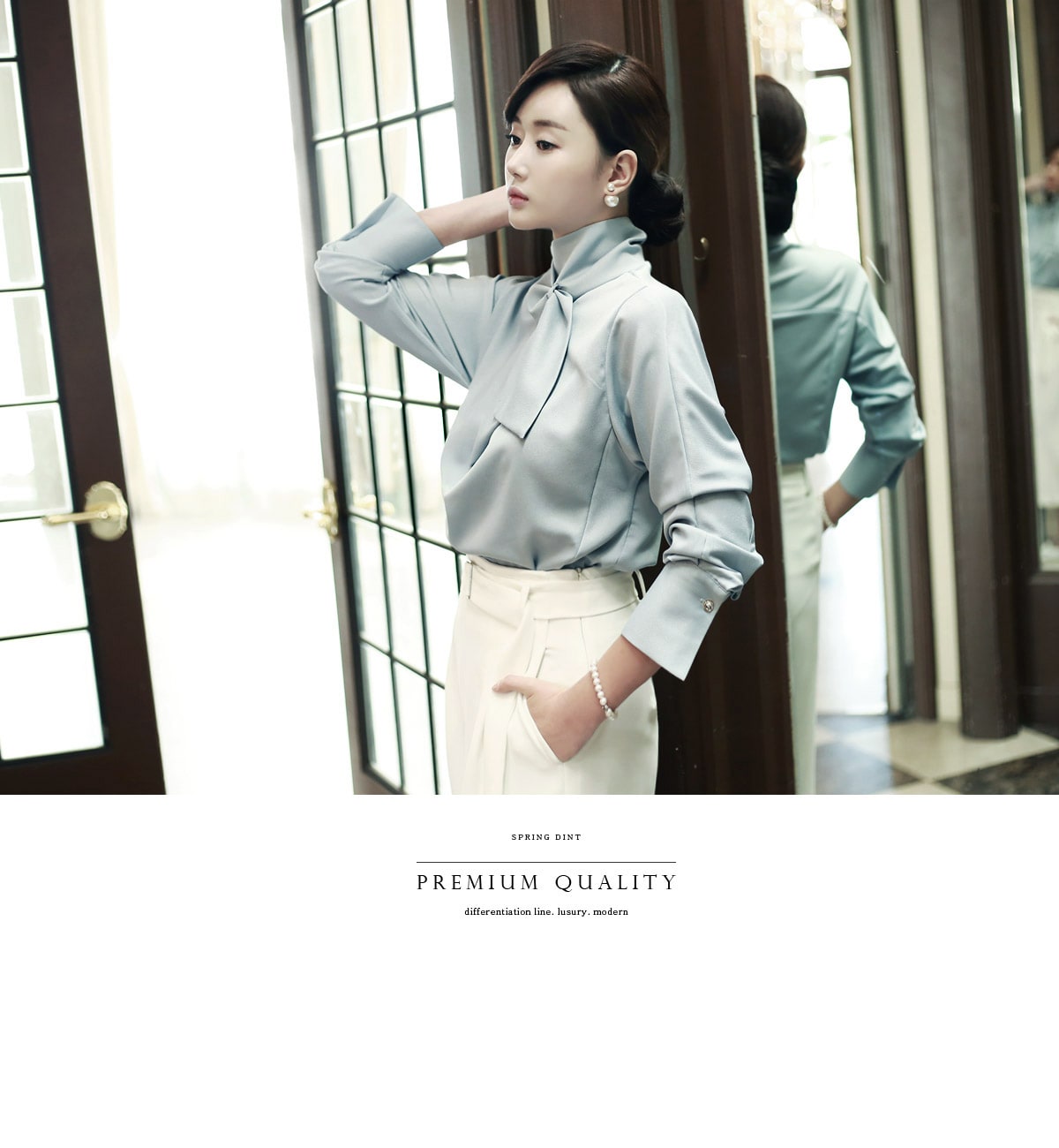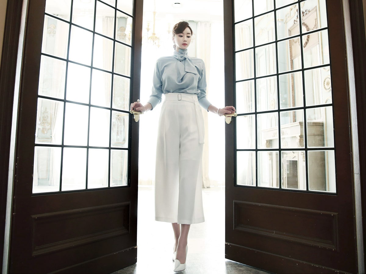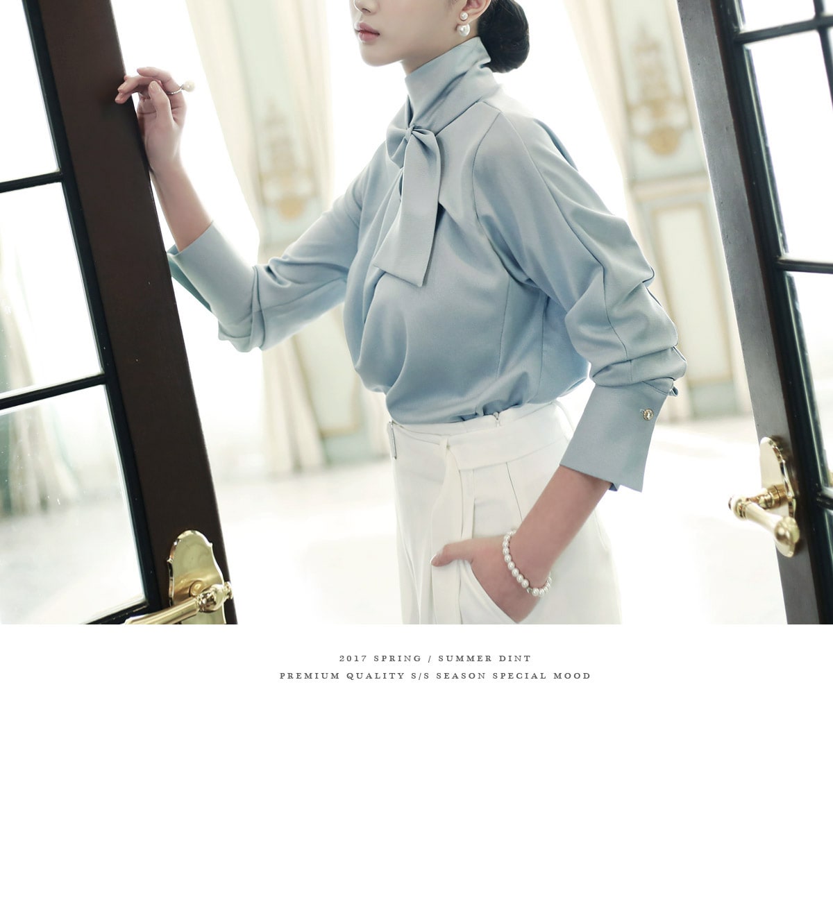 B1935 로어 스카프 넥 샤인 블라우스 Sora
