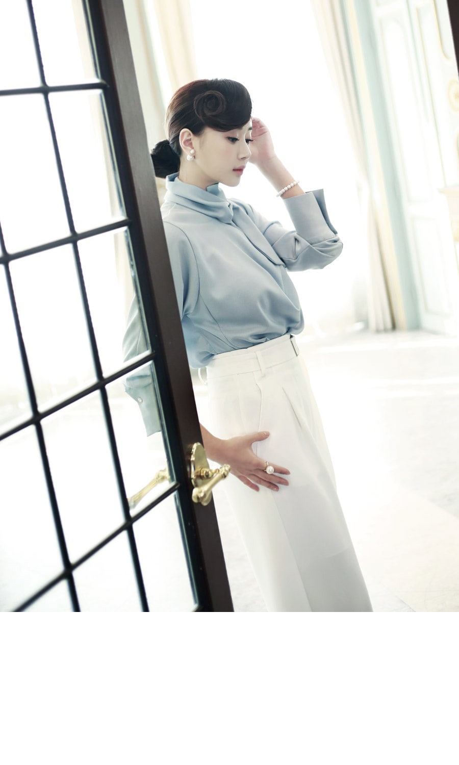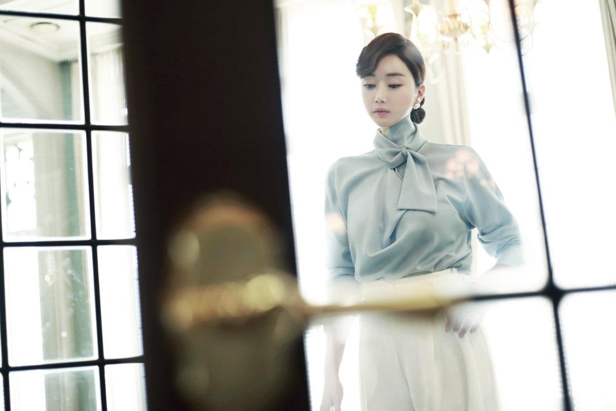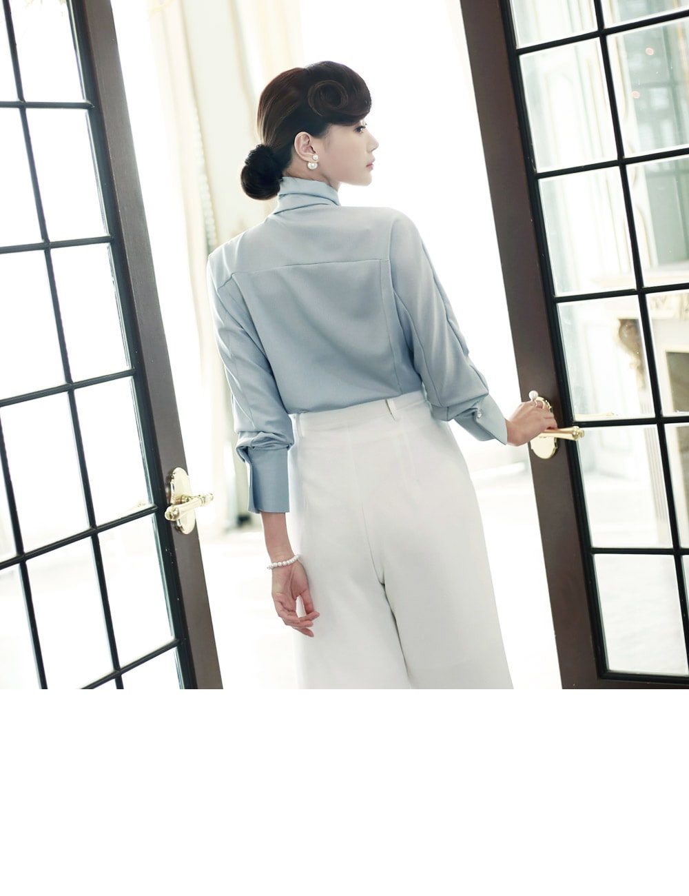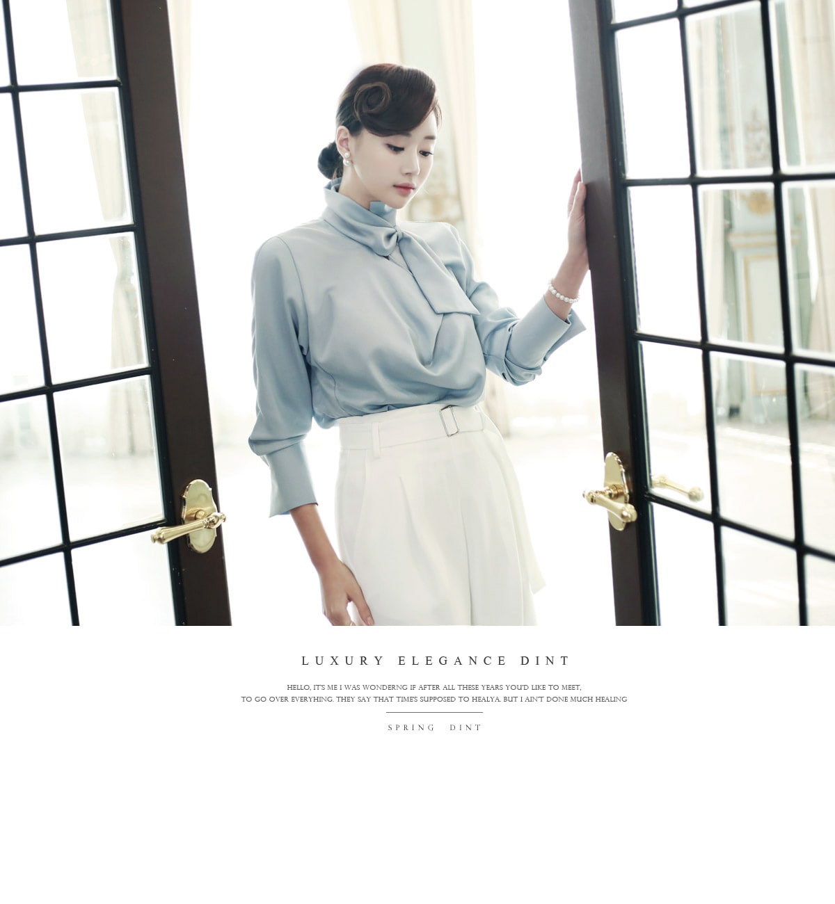 B1935 로어 스카프 넥 샤인 블라우스 Sora