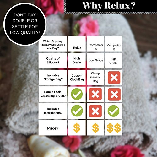 HUGE VALUE Whilst a Relux cupping kit may be small and inexpensive, if offers huge versatility and provides the answer to many of your health problems! ♡ Inexpensive Skin Treatment Why buy so many different skin products, when one cupping kit can tackle a vast range of problems on its own? Use natural cupping therapy for younger, healthier looking skin without exposing yourself to a ton of harmful chemicals. ♡ Muscle Pain Relief Release the tension built up in your muscles or aid your sports injury rehab in an enjoyable fashion by using cupping therapy. Just a few minutes of suction and massage from Relux cups can leave your body in a pain free, relaxed state. ♡ Other Health Benefits Include: Reduced cellulite and wrinkles, muscle pain relief, headache and tension relief, improved metabolism, increased circulation, removal of toxins, lower blood pressure, reduced inflammation, improved sleep quality, improved hormone regulation, stress and anxiety relief ♡ It's So Easy To Get Results! Cupping doesn't just get you the results you deserve, but unlike other monotonous health care routines it is fun and feels great! Just use 5-10 minutes per day. It even comes in a Relux bag so you can use it on the go, no matter what your lifestyle. ♡ Just 4 Simple Steps: 1. Apply an oil or cream for lubrication 2. Squeeze the cup 3. Place on skin of target area and release the squeeze applied to cup 4. Slide in zig-zag or circular motions over the area for 5-10 minutes, daily That's all there is to it! (Check your email for a PDF guide to cupping therapy) ? BONUS ? You will also receive a bonus silicone facial cleansing brush so your face appears more vibrant and luminous than it ever has before! 0 |
