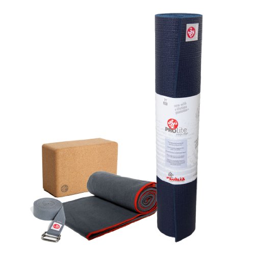 Amazon.com The Beginners Deluxe Yoga Package from Manduka provides both beginning and seasoned with yogis the tools they need for a deep and well supported practice. The Deluxe Package for men comes in distinctive, rich blue hues that will stand the test of time. Boasting both convenience and performance, the Manduka equipment is lightweight and supportive, ideal for home and studio practice. With a lifetime guarantee, the PROlite 71-inch yoga mat is exceptionally portable weighing just 4 pounds, yet offers the supportive performance surface needed for a comfortable practice. The standard-sized eQua (tm) mat towel packs up light, fits seamlessly over the mat, provides non-slip support even when moist, and offers multiple uses for gym, studio, home, and travel use. The Cork Block provides practitioners the support they need for proper alignment with materials that are both sustainable and uniquely suited to the practice. Finally, the 8-foot natural cotton yoga strap improves upon B.K.S. Iyengar's original design with upgraded materials and a better buckle. Manduka PROlite Mat: Offered with a lifetime guarantee, Manduka PROlite yoga mats are a great choice for people who want a lighter, zero-waste, high-performance mat with superior quality and comfort. The PROlite mat has a slip resistant, yet non-sticky surface that performs even when wet from perspiration. Boasting superior wear and longevity, the mat is OekoTex certified and created with emissions-free manufacturing for true zero-waste, sustainability. PROlite Mat Specifications: - Weight: 4.0 pounds