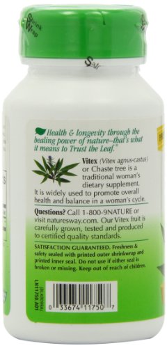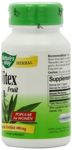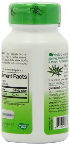 -. Binding : Health and Beauty -. Brand : Nature's Way -. Feature : 3 Bottles of 100 Capsules / Woman's dietary supplement / Vitex is widely used to promote overall health and balance in a woman's cycle / Chaste tree berry, 400 mg -. Label : Nature's Way -. Manufacturer : Nature's Way -. ProductGroup : Health and Beauty -. ProductTypeName : HEALTH_PERSONAL_CARE -. Publisher : Nature's Way -. Studio : Nature's Way -. Title : Nature's Way Vitex (Chaste Tree), 400 Mg, 100 Capsules (Pack of 2)