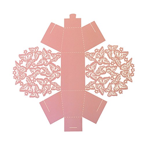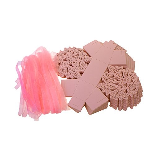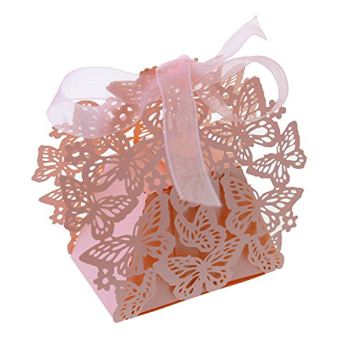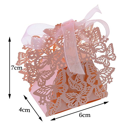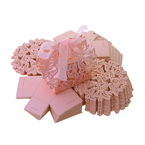 UNIQLED Pack of 60 Butterfly Laser Cut Wedding Favor Box Chocolate Gift Candy Boxes Bridal Baby Shower Party Cubic with Ribbons (Pink)
