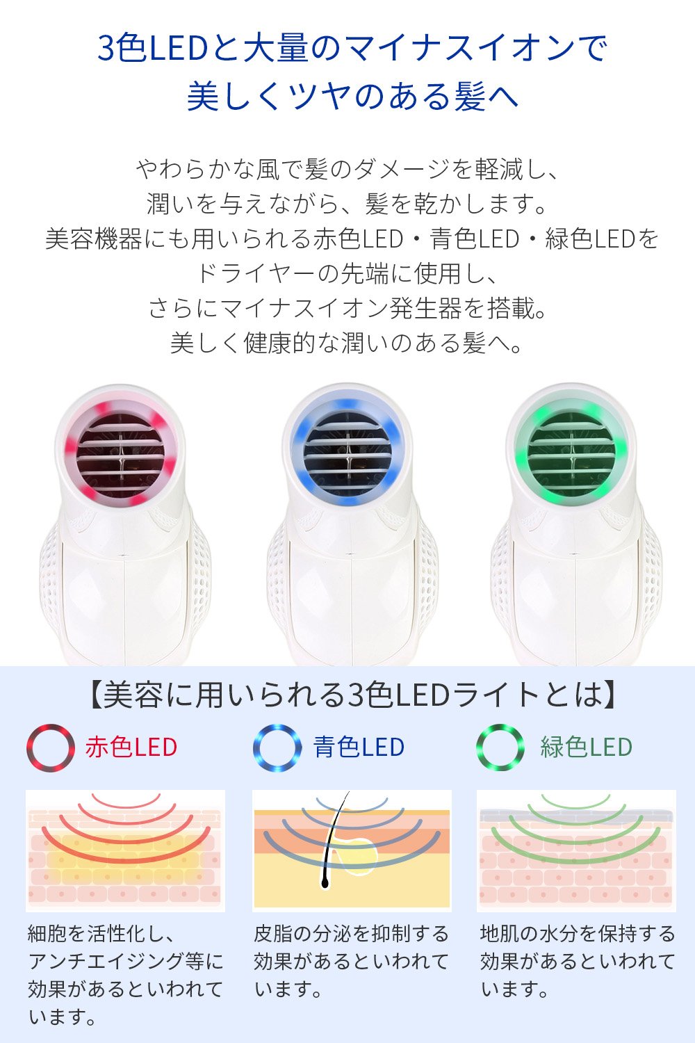 ●直感的に風量を調節できるダイヤル式インターフェース。手元のボタン1つで、かんたんにモード切り替え。3色のLEDライトが、風の効果を分かりやすく伝えます(青:マイナスイオン、赤:赤外線、緑:冷風)。