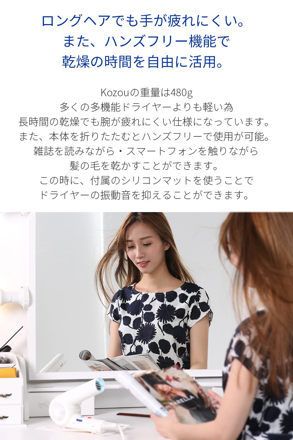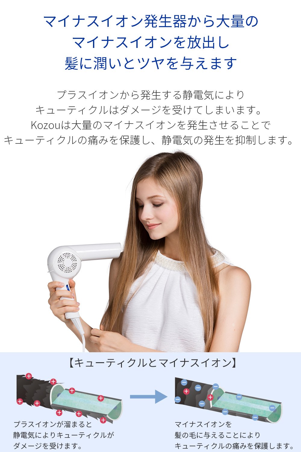 ●3色LEDとマイナスイオンを搭載した、【Areti アレティ】モイストケアドライヤー Kozou。日本人の繊細な髪質に寄り添った30通りの風を実現。お子様からご年配の方まで、髪の傷みを軽減してツヤと潤いを与えます。
