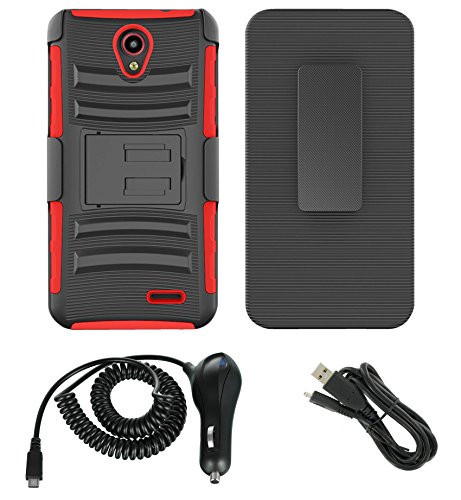 -. Feature : Premium dual layer red armor impact resistant kickstand case with belt clip holster combo, Atom LED, tempered glass [0.33mm 9H Hardness] screen protector, 2.1A (2,100 mAh) car charger, micro-usb cable / Tough heavy duty red case protector is made of soft silicone gel on the inside and hard PC material on the outside. Dual layer build provides excellent shock protection from high impact falls and drops / Tempered glass surface (8-9H hardness) has an oleophobic coating that prevents fingerP.R.Ints and other contaminants and makes the screen easy to clean. Back is coated with a strong adhesive that makes for easy installation / Car charger output current 2.1A (2,100 mAh). Output voltage 5 - 5.30V. Input Voltage 12 - 24V. 8 ft. cable length. Dual sync and charge micro usb cable [Length: 3ft.] / Compatible with the ZTE Avid Plus Z828 on the T-Mobile, Metro PCS networks