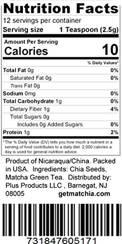 -. Feature : Highest Quality Matcha + Chia = MATCHIA / Highly antioxidant "Super Food". Heart healthy Omega 3's. / High fiber. Protein packed. / Organic and Vegan. / Money back if not completely satisfied.