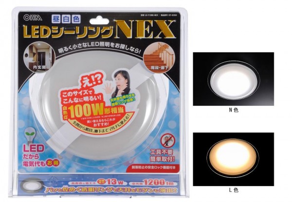 | 仕様 | 電源:100V・50/60Hz 消費電力:13W 全光束:N色1050ルーメン、L色1200ルーメン 動作温度範囲:0~40度 |