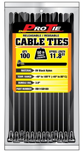 Pro Tie RB11SD100 11.8-Inch Releasable Standard Duty Cable Tie, UV Black Nylon, 100-Pack