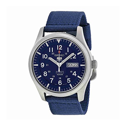 Seiko Stainless Steel Case Automatic Blue Dial Nylon Strap Men The Seiko5 collection. Stainless steel case measures 40mm diameter by 11mm thick. Brushed and polished link bracelet includes genuine nylon strap. Blue dial has silver tone