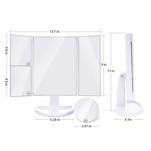 - 10x MAGNIFICATION SPOT MIRROR:3 panels and a wide-angle viewing for you to see clearly your facial features. Side-view makeup mirror panels adjust for custom viewing.10X/3X/2X/1X magnification used together for perfect makeup