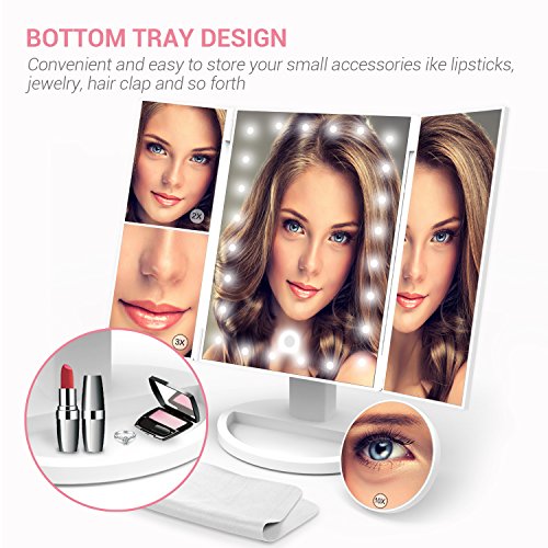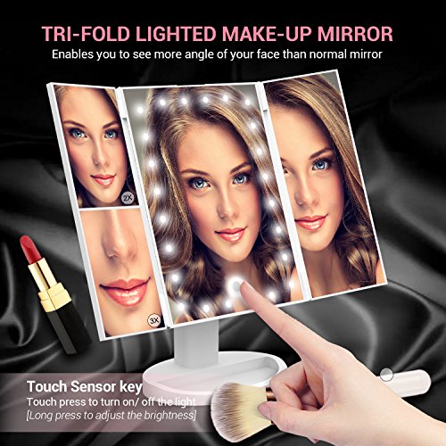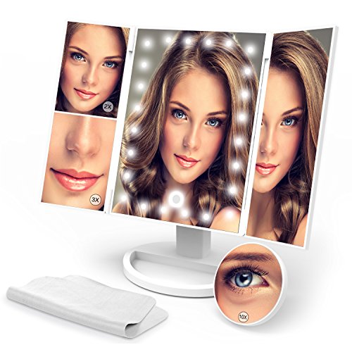 Olivivi Led Lighted Vanity Mirror Trifold Makeup Mirror 10X/3X/2X/1X Magnification Trifold Mirror 21 Led Lights, Touch Screen, 180°Adjustable Rotation, Dual Power Supply, Countertop Cosmetic Mirror