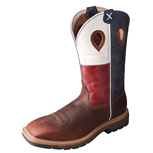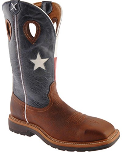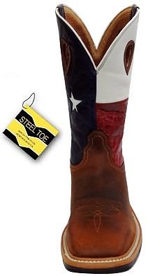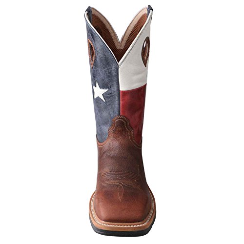 Studio : Twisted X Publisher : Twisted X Binding : Apparel Product Description Twisted X Boot Company proclaims, "We're making 'em right" When it comes to cowboy boots for real cowboys, Twisted X knows you want to pull on your boots comfortable and leave them on comfortable. The Twisted X pull-on work boot features a smooth leather foot under a 12" leather shaft with Texas flag design. Mesh fabric lining. 1 3/4" block heel. Double stitched welt. Easy-on pull holes and square steel toe. Imported. 0