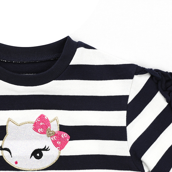 설명:모던한 네이비 컬러의 다이마루 소재의 맨투맨입니다. 기존에 나오는 맨투맨과 다르게 소매에 제원단 프릴 장식을 주어 좀더 큐트한 디자인으로 제작되었습니다. 블링블링한 화이트 고양이 포인트로 귀여우면서 산듯한 느낌을 주었습니다. 데님 팬츠와 레깅스와 코디하여 편안하게 입히기 좋은 데일리 아이템입니다.