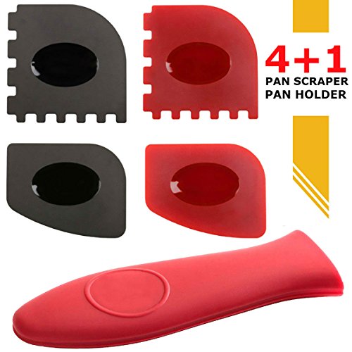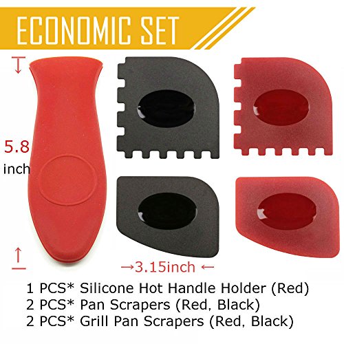 【PACKAGE INCLUDE】 2 PACK*Durable Grill Pan Scrapers(Red, Black);2 PACK*Durable Pan Scrapers(Red, Black); 1 PACK* Silicone Hot Handle Holder(Red) {Warning:Not intended for use in oven.}