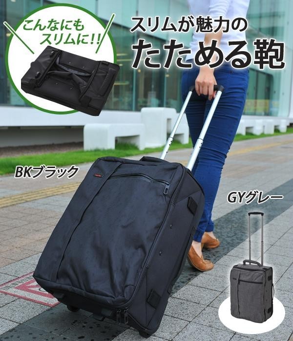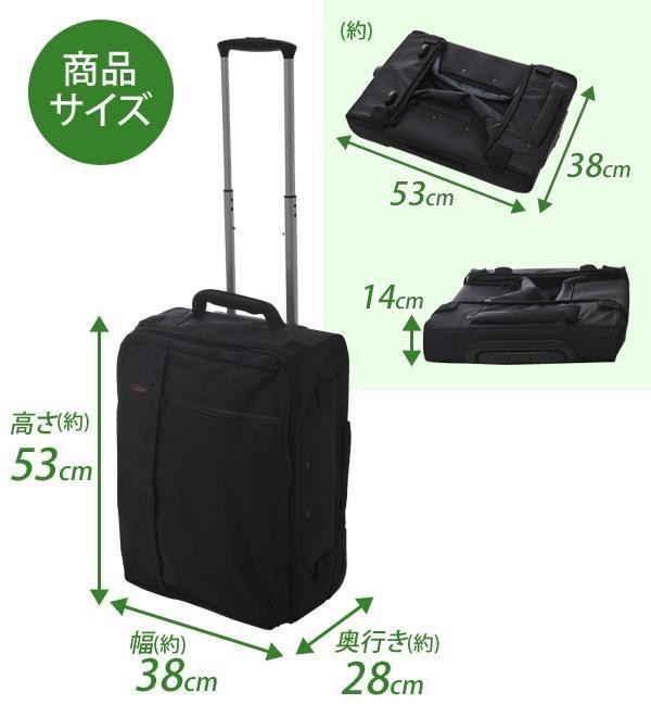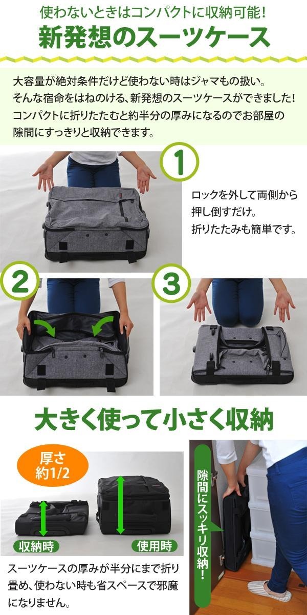 | 折り畳んだ時の厚みは使用時の半分!!使わない時に隙間にスッキリ収納できる便利なスーツケース。機内持ち込みサイズなので、旅行や出張等にも♪ |