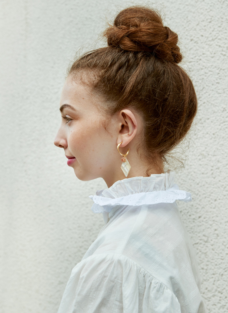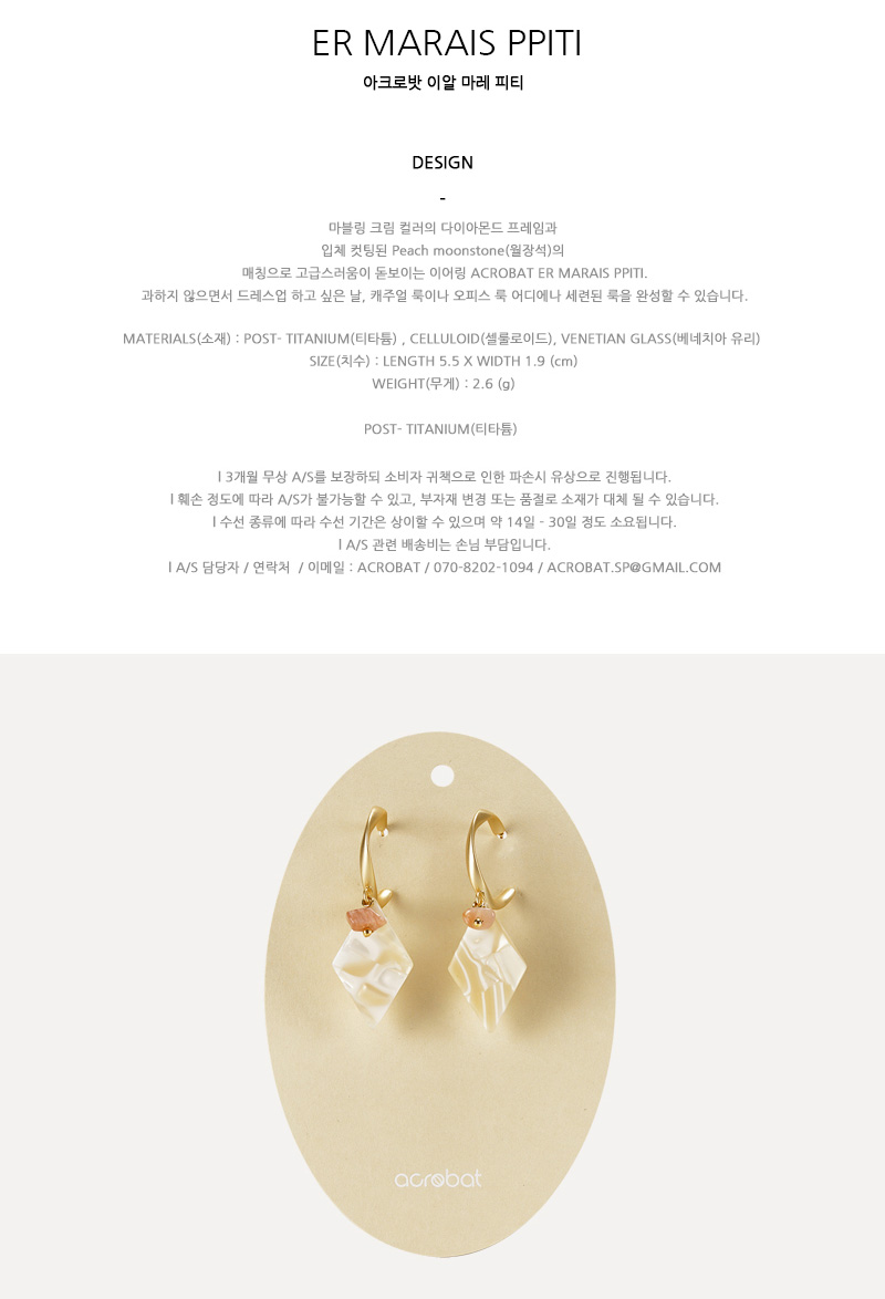 l 마블링 크림 컬러의 다이아몬드 프레임과 입체 컷팅된 Peach moonstone(월장석)의 매칭으로 고급스러움이 돋보이는 이어링 ACROBAT ER MARAIS PPITI. 과하지 않으면서 드레스업 하고 싶은 날, 캐주얼 룩이나 오피스 룩 어디에나 세련된 룩을 완성할 수 있습니다.
