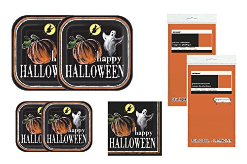 -. Feature : Ghostly Halloween Themed Bundle for 20 Guests / 24 Ghostly Halloween Themed 9" Square Dinner Plates / 20 Ghostly Halloween Themed 7" Square Dessert Plates / 20 Ghostly Halloween Themed Lunch Napkins / 2 Coordinating Orange Plastic Table Cover 54" x 108"