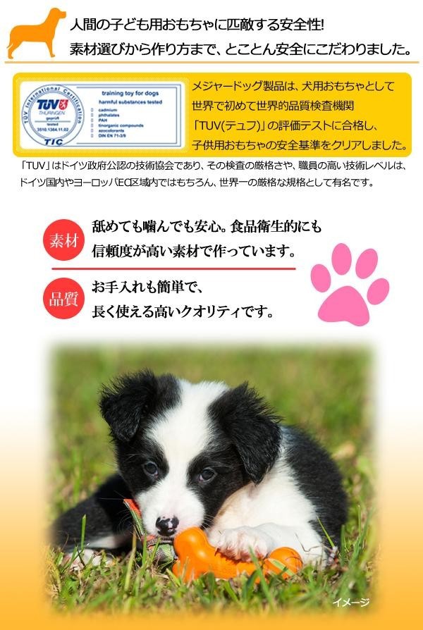| 素材は耐久性が高く、ワンちゃんが噛んでも安心・安全なものを使用しています。ワンちゃんが長く楽しめるよう様々な工夫がなされているおもちゃです♪そのクオリティの高さは、ドッグトレーナーも愛用している程です! |