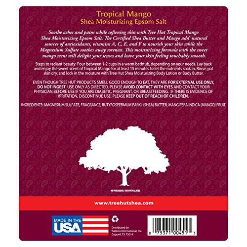 -. Binding : Health and Beauty -. Brand : Tree Hut -. Label : Tree Hut -. Manufacturer : Tree Hut -. NumberOfItems : 1 -. PackageQuantity : 1 -. ProductGroup : Beauty -. ProductTypeName : BEAUTY -. Publisher : Tree Hut -. Studio : Tree Hut -. Title : Tree Hut Shea Moisturizing Epsom Salt