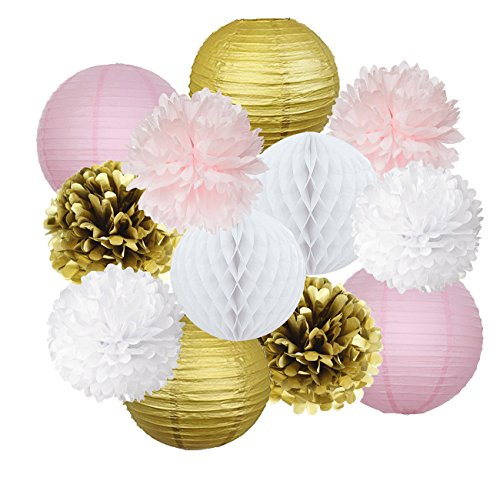 -. Binding : Toy -. Brand : Furuix -. Color : Pink Gold White -. Department : unisex-child -. Feature : Give a special touch to your next party with this darling combination of hand-made tissue paper pom poms, honeycomb tissue balls and paper lanterns. / Pink Gold Party Decoration/ Wedding Party Decorations KIT INCLUDES (12PIECES):4pcs paper lanterns of 8 inch in diameter:2*pink+2*gold;6pcs 10inch tissue paper pompom:2*white+2*pink+2*gold;2pcs 6inch white honeycomb balls; / This gorgeous combination of coordinating hand-made tissue paper pom poms and paper lanterns will create the WOW factor that you are looking for at your next party. / This kit is the perfect hanging party decor for a P.R.Incess themed birthday party or baby shower - or any pink and gold party / Tissue pom poms arrive flat and include instructions for fluffing. Paper lanterns arrive flat and include instructions for expanding. -. IsAdultProduct : 0 -. Label : Furuix -. Manufacturer : Furuix -. MPN : PWGK-1 -. PackageQuantity : 1 -. PartNumber : PWGK-1 -. ProductGroup : Art and Craft Supply -. ProductTypeName : ART_SUPPLIES -. Publisher : Furuix -. Studio : Furuix -. Title : Pink Baby Shower Decorations Furuix 12pcs Pink Gold Party Decoration Kit Tissue Paper Pom Pom Honeycomb Ball and Paper Lantern for Girls' Birthday Party Favors Wedding Party Decorations