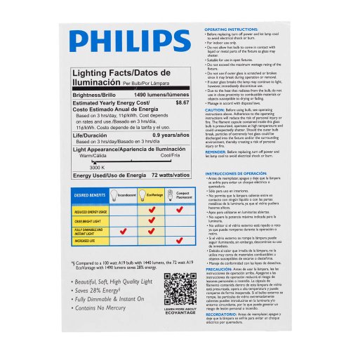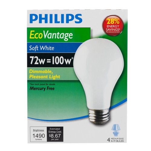 Philips 426049 72-watt A19 Dimmable Halogen Light Bulb, Soft White, 4-Pack