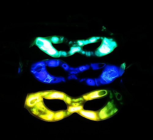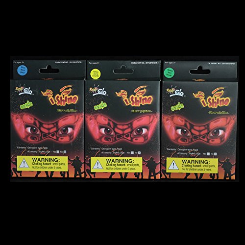 -. Brand : Happyglow -. Color : Green, Blue, Yellow -. Department : Unisex-child -. EAN : 0087169149900 -. Feature : Includes three packs glow eye mask for great masquerade fun! / Green, blue, yellow. Colors may vary / Fun and easy to activate. / Ideal for birthday parties, night activities and carnivals -. PackageQuantity : 3 -. ProductGroup : Apparel -. ProductTypeName : CHILDRENS_COSTUME -. Size : One Size fits All -. Title : 3 Pack Premium IShine Eye Glow Mask Glow in Dark Costume Party - Assorted 3 Colors