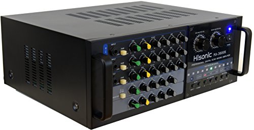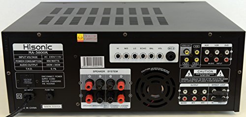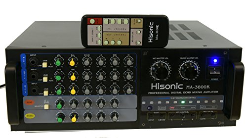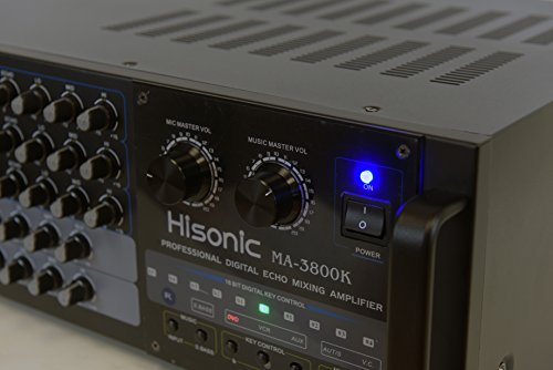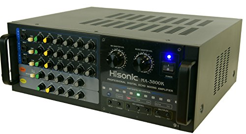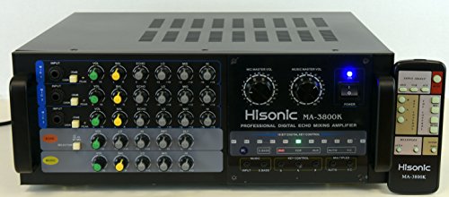 Designed by German engineers, Hisonic is known for its quality and durability. This professional mixing amplifier is built to sustain continuous usage at maximum wattage output. It is a perfect companion for DJs VJs,and KJs who are seeking for a reliable component that will carry them throughout the long night without the nightmare of equipment failure. MA3800K is the right one for all the occasions. ? ? Specifications: Audio Output: 380W 380W Output @ 8 Ohm Microphone input sensitivity: 0<15mV Frequency Band: 25Hz to 20kHz Dimension: 430mm(W) x 156mm(H) x 335mm(D) Electricity consumption: 650W Ultra Quiet Cooling Fan Weight: 38 lbs Microphones inputs 3 x 1/4" Microphone Inputs Input Signal Attenuators Auto-gain level indicators Individual Microphone Volume Control Individual Balance Control Individual Echo Depth Control Individual Bass/Mid-range/Treble Control? Master Music Volume Control Master MIC Volume Control Echo Control Depth control Bass control Treble control ? Input Selector from 3 Audio Sources Balance control 16 Bit Digital Key Control Multiplex Compatible Auto Singing-mate switch ( Match with Multiplex karaoke media) Vocal cancellation switch (?Match with Multiplex karaoke media) Full Function Remote Control 0 |