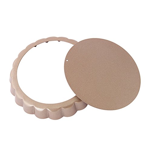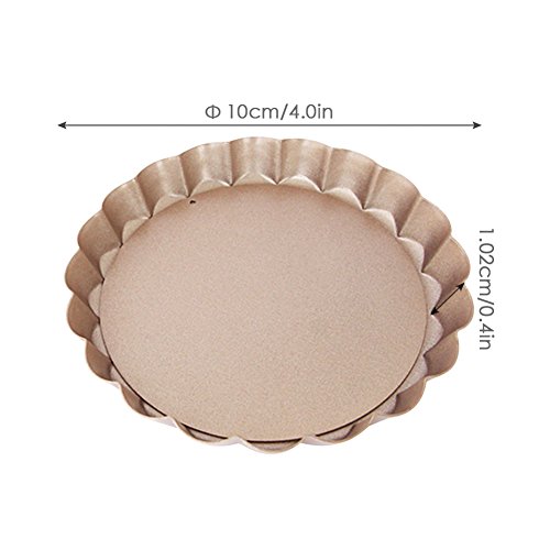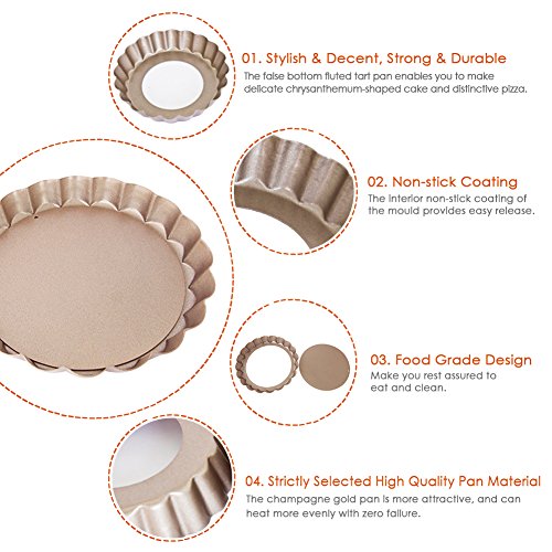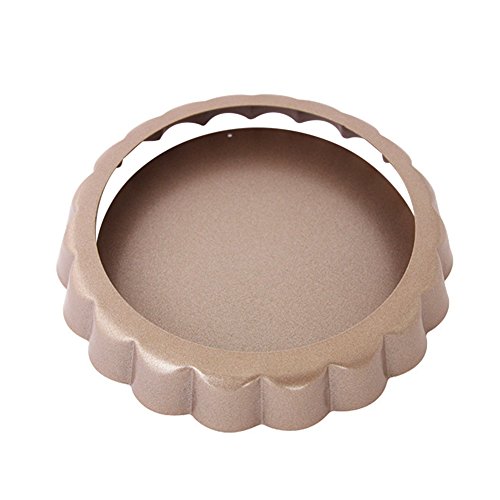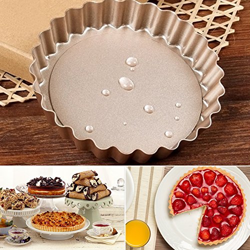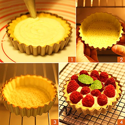Studio : Myonly Publisher : Myonly Product Description Features: 1. Set of 4 non-stick mini tart pans with 4-inch diameter and 0.7-inch height. Non-stick Round Bakeware Perfect for individual fruit tarts or desserts. 2. Heavy gauge carbon steel construction for even heating. The nonstick coating is easy to clean. 3. Large quiche pan with removable bottom is safe up to 450 degrees Fahrenheit. 4. The fluted sides increase the surface area, which in turn creates a strong crust capable of holding and containing the heavy ingredients of a quiche or a fruit tart. Removable bottom provides easy release and clean-up. 5. Nonstick bakeware Perfect for creating tarts, quiches, creamy cheese cakes, chocolate cakes, muffins, cupcakes, brownies and other delicious desserts. 6. No more struggling with cleaning the pan after cooking, especially the grill pan's detachable bottom. We recommend a hand wash, but it is also dishwasher safe. 0