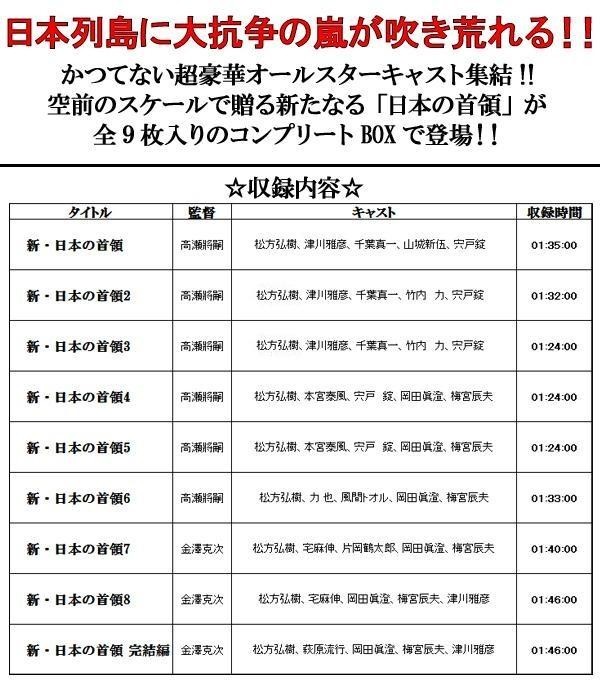 松方弘樹を主演に向かえ、超豪華キャスト集結の王道極道巨編「日本の首領」シリーズ全9作品を収録した、見応えたっぷりのDVDBOXです。 |