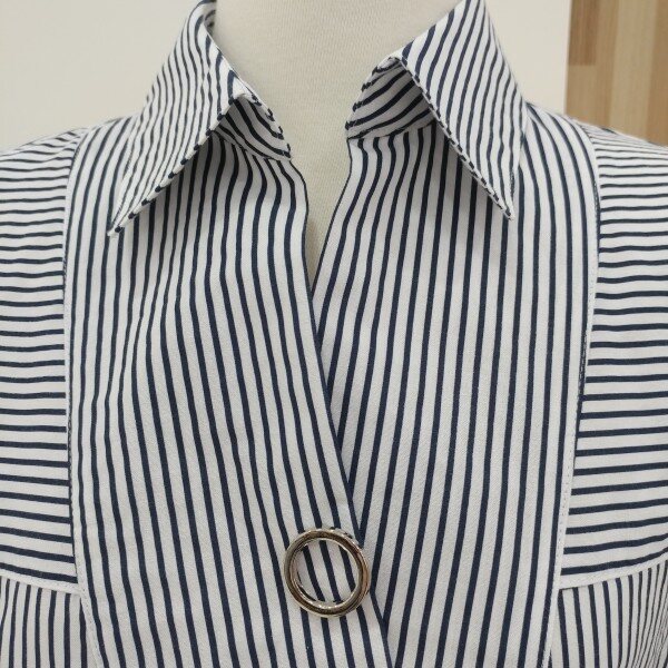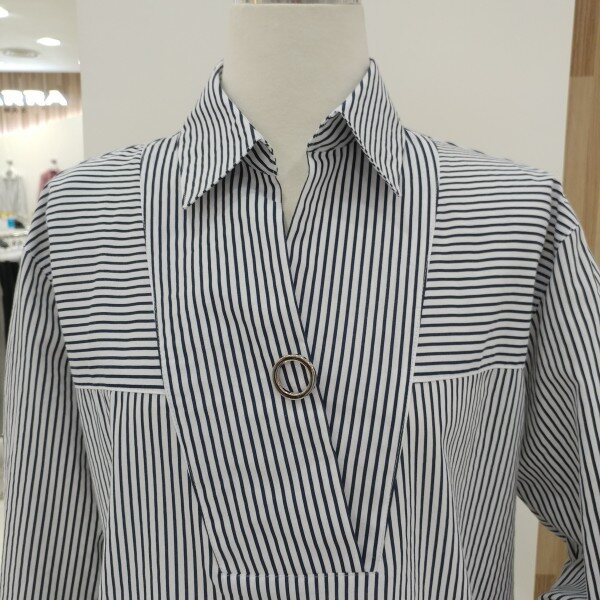 기본 카라넥라인에 세련된 페이스라인을 선사하는 제품으로 앞면중앙에 버튼포인트 주어 세련됨은 물론