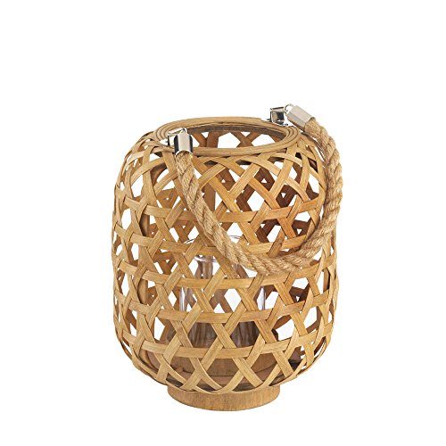 -. Feature : Place the candle of your choice inside the clear hurricane glass, and then set the lantern on its base or hang it from the thick rope handle. / Dimensions: 7" diameter x 9 1/2" high; 17" high with handle. / Item weight: 0.8 lb. / Bamboo and glass.