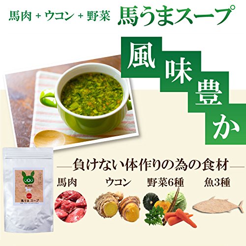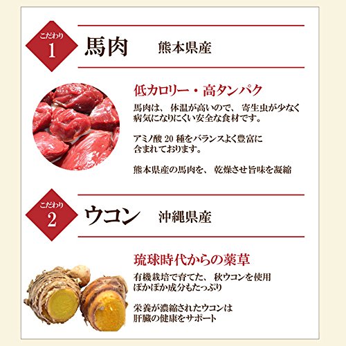 原材料:馬(馬肉)・かつお・いわし・うなぎの骨・有機 秋ウコン・キャベツ・にんじん・ごぼう・おから・ほうれんそう・かぼちゃ・ブドウ糖 たんぱく質9.5g/脂質:4.1g/炭水化物:5.5g /食物繊維2.6g