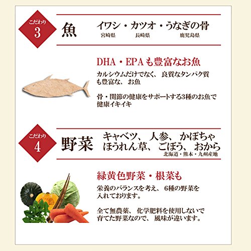 素材構成:馬(馬肉)・かつお・いわし・うなぎの骨・有機ウコン・キャベツ・にんじん・ごぼう・おから・ほうれんそう・かぼちゃ・ブドウ糖