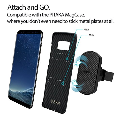 Best compatible with PITAKA S8/S8+ case which are built with metal plates inside,but works well with any other phone case by sticking adhesive metal plate; Package Includes : 1 x PITAKA Magnetic car mount; 1 x Rectangular metal magnetic plate