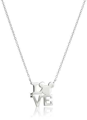 Sterling silver necklace featuring stacked "LOVE" pendant with Mickey Mouse silhouette as letter "O"