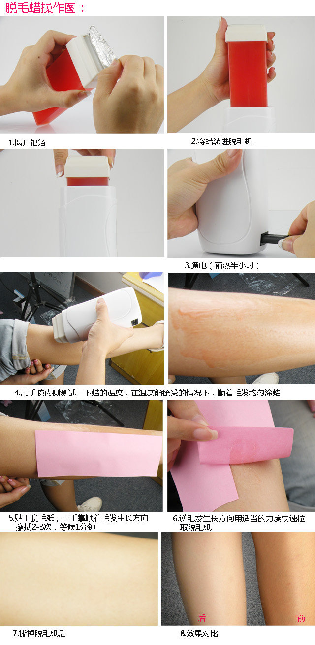 Note: wax block heating time, 15-20 minutes. Many friends say how off or not off, here must pay attention to three points: First, when the wax coating must follow the direction of hair growth smear; Second, tear it must reverse the tear, that is, hair growth The third is to tear off the paper when the time must be a quick tear, do not slowly opened; This is one hundred percent off, the residual wax can be rubbed off with olive oil. The wax block is used up in the wax machine, cover the lid, put vertical storage, leaving for the next stand-by.