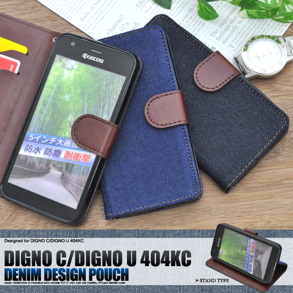 デニムデザインのDIGNO C/DIGNO U 404KC?/ KYOCERA S301?用スタンドケースポーチ。