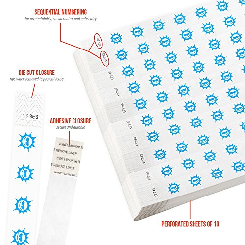 -. Feature : Waterproof / Non Transferable / Strong Adhesive Closure / 500 wristbands in sheets of 10