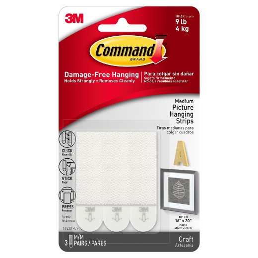 No more nail holes, cracked plaster or sticky residue. Command™ Picture Hanging Strips make decorating quick and easy. One click tells you Picture Hanging Strips are locked in and holding tight. Best of all, when you are ready to take down or move your pictures, they come off cleanly — no nail holes, cracked plaster or sticky residue. Command™ Picture Hanging Strips come in three sizes: Small strips hold most 8” x 10” frames, medium strips hold most 18” x 24” frames and large strips hold most 24” x 36” frames.