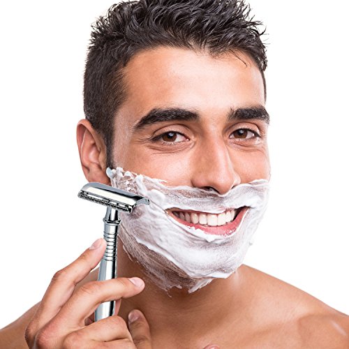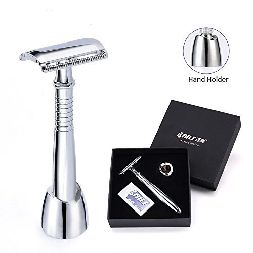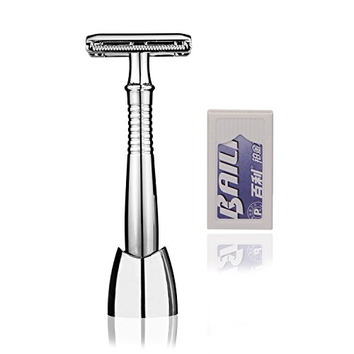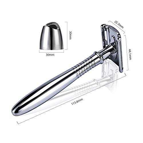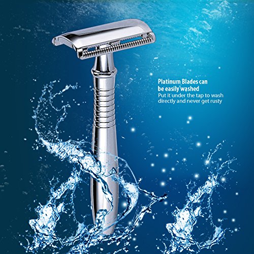 【What You Get】 When shaving be a part of life, you will fall in love with the enjoyment of shaving. A man need a smooth and close shave with a personal razor. Product including: a long handle safety, a razor stand, 5 pcs platinum blade, gift box. Substantial fine polished razor set. Placing it on your counter make you feel kind of noble. 100% money back guarantee, no risk to buy!